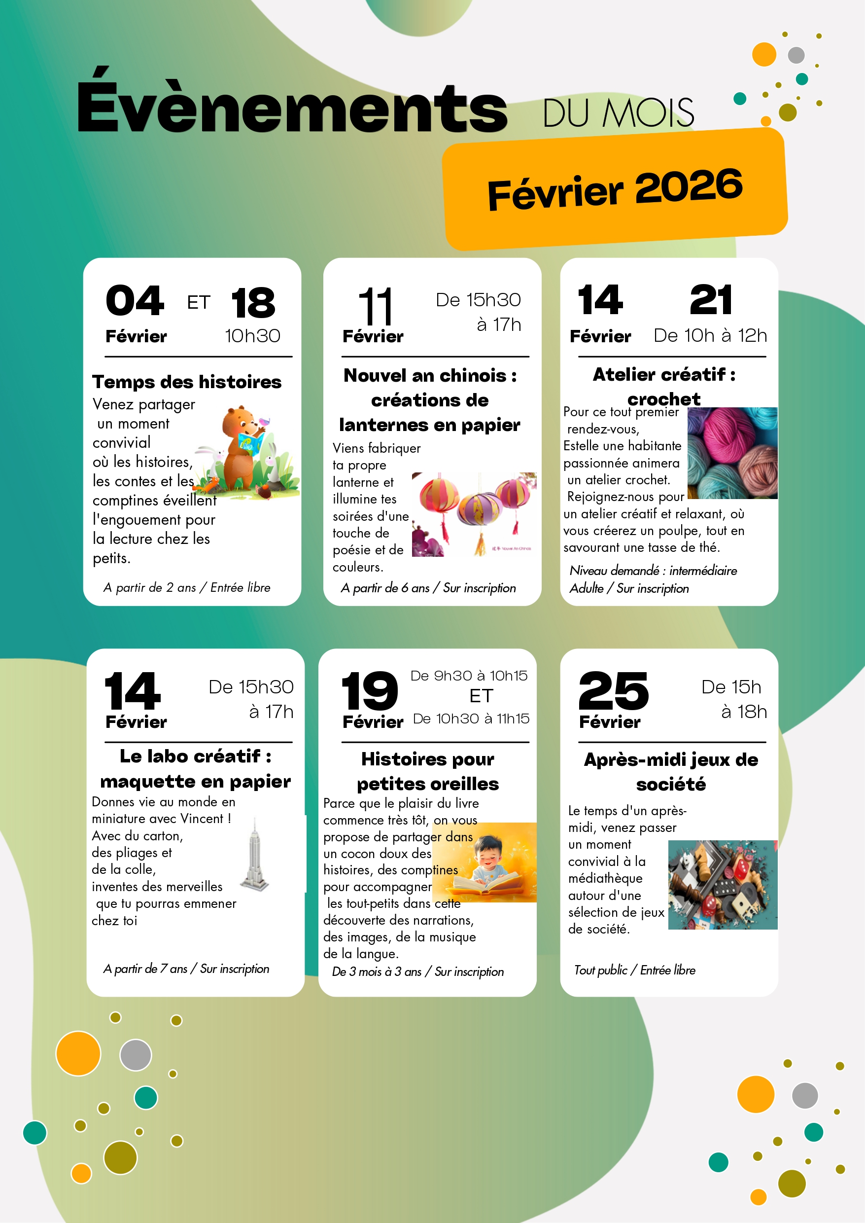 - Histoire pour les petits oreilles : à 9h45 ou à 10h30, un Jeudi par mois